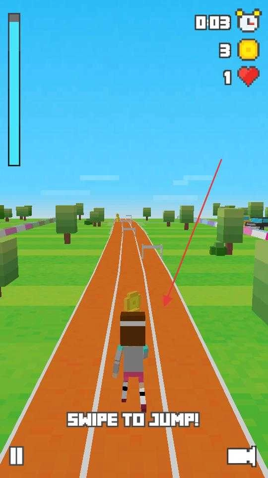 2、奔跑途中若碰到障碍物,就依照提示滑动屏幕使角色跃起,避开障碍物后继续往前跑,同时维持好角色的奔跑节奏,尽可能收集更多金币。