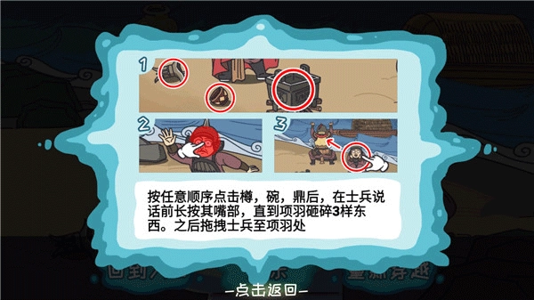 按任意顺序点击樽、碗、鼎这三样物品后,在士兵开口说话之前,长按其嘴部位置,一直保持到项羽将这三样东西都砸碎。完成这些步骤后,把士兵拖拽到项羽所在的位置,就能顺利通关了。