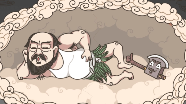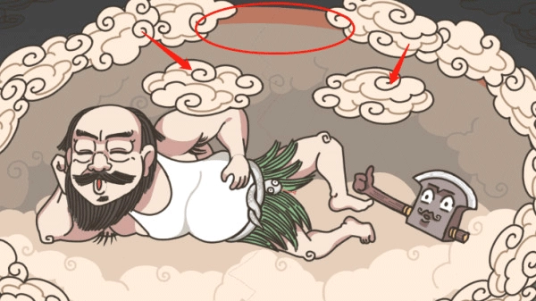 进入游戏后可以看到盘古在一个云团也一样的蛋克里面睡觉,在脚边还有一把斧头,这就是开天的工具。