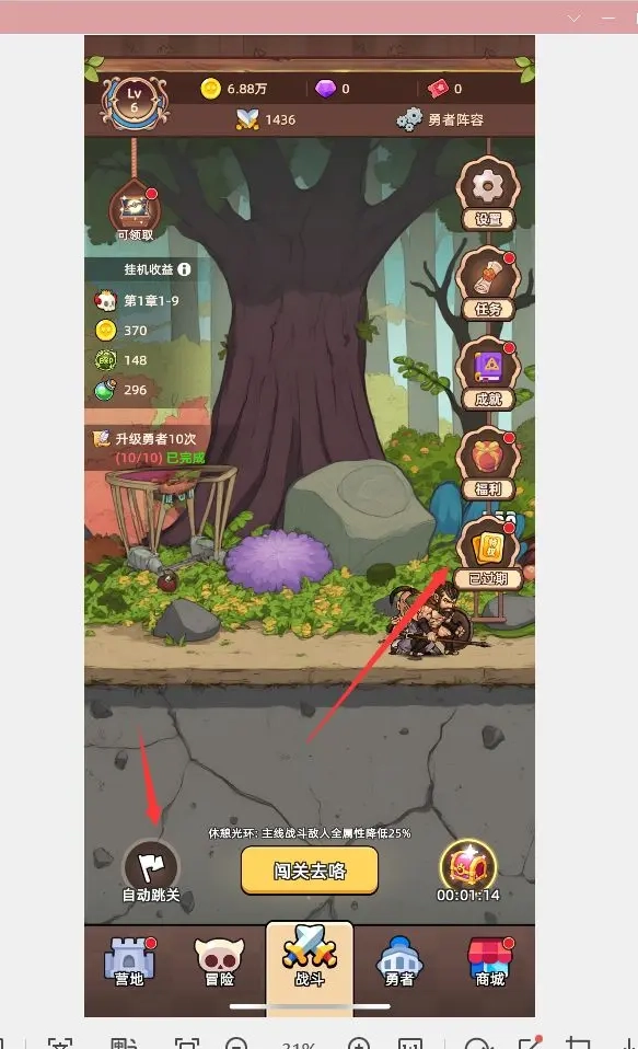 开局推进关卡,很快就能开启2倍速推图模式。开启二倍速后退出关卡界面,回到游戏首页,观看特权卡相关的广告,就能解锁自动推图功能和3倍速。游戏前期只有3个英雄,等角色等级达到5级解锁勇者酒馆后,就可以通过看广告获取抽卡机会;接着去商城看广告攒钻石,再把代金券兑换成钻石,然后在勇者酒馆进行100次或200次抽卡,一般能获得5张新卡,这样就能继续推进一段时间的关卡。要是推图遇到瓶颈,就返回城镇领取挂机收益,强化装备后再继续推图。