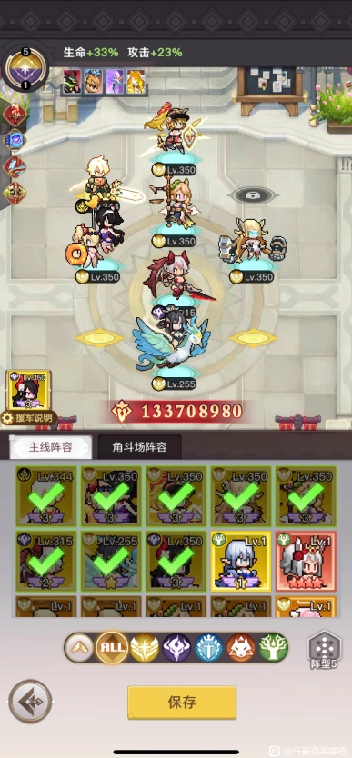 先来点简单的,阵型。这个游戏最强的阵型就是我这个。原因是这个游戏最重要的属性是速度,先手的优势巨大。把强力角色四个一排站,配合宠物黑兔子,3星技能同排加速10%,一下超车对面,赢面增加。