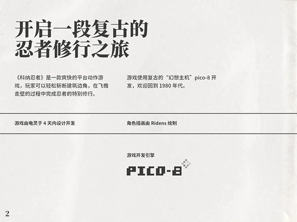 欢迎重返1980年代,在一台虚构的幻想主机Pico-8上,体验一款当年并未问世的复古游戏《科纳忍者》。现在就行动起来,翻开《〈科纳忍者〉游戏说明手册》,搞清楚这款游戏究竟该怎么玩吧!