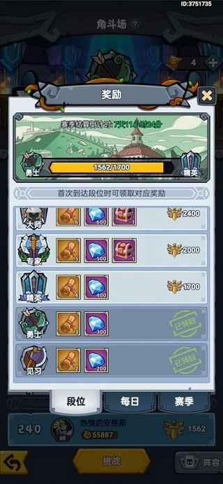 各位冒险者或许最容易忽略,角斗场的奖励十分丰厚:除了挑战成功能拿到基础金币奖励外,提升赛季历史排名可获得钻石奖励;积累更多积分来提升段位,首次达成对应段位时还能领取段位奖励;每日排行榜以及赛季排行结算之际,也能拿到相应的奖励。