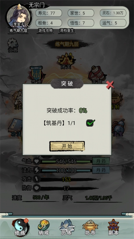 1、打开游戏,我们能够看到一个非常真实的修仙过程。