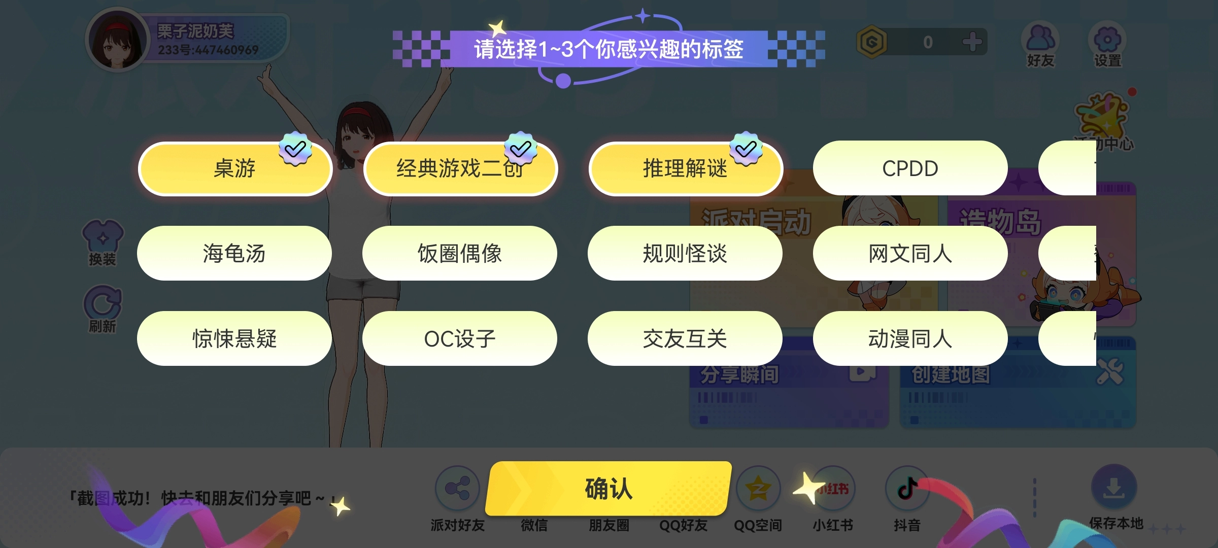 2、选择1-3个感兴趣的标签,点击确认。