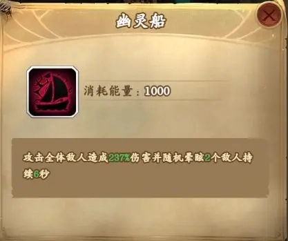 专属技能-幽灵船:消耗能量1000,攻击全体敌人造成237%伤害并随机眩晕2个敌人持续6秒