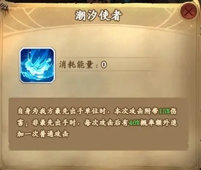 刻印技能-潮汐使者:当自身是我方首个出手的单位时,本次攻击将附加15%的伤害;若不是首个出手,则每次攻击后有40%的概率额外追加一次普通攻击。该刻印技能需在开服20天后,待英雄刻印系统开启时方可激活。