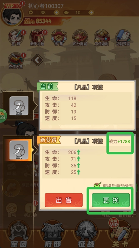 6、获取到更高阶的装备时,系统会自动用它替换身上的低阶装备,并将被替换的低阶装备出售,以此换取经验与钱币;而当获得低阶装备时,则能直接将其出售来获取各类奖励。