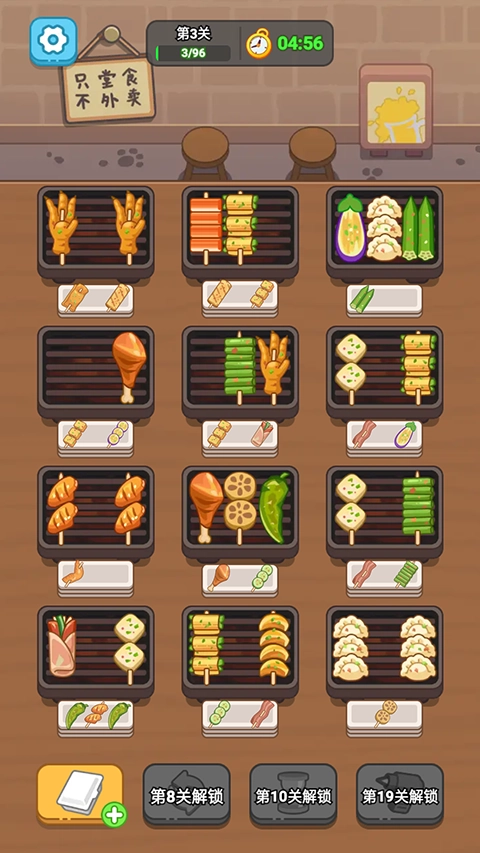 《疯狂烧烤摊》是一款玩法独特的消除类游戏。在游戏里,玩家将化身烧烤摊老板,核心操作是把相同的烤串凑到一块儿——当某个盘子里的三串烤串完全相同时,就能触发一次消除,玩法简单却充满乐趣。游戏采用闯关模式,每个关卡都设有特定的消除目标次数,玩家需要在限定时间内达成该次数,才能顺利通关获胜。随着关卡推进,游戏难度会逐步提升,想要更轻松地完成关卡挑战,巧妙运用策略与智慧会是个好办法。
