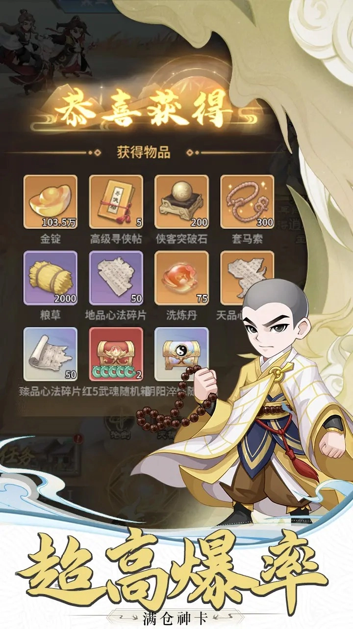 1、游戏里提供的无限抽卡机会,能助你轻松招揽到各类传奇侠客,不管是威名远扬的武林盟主,还是遁世山林的神秘高手,都有可能成为你的左膀右臂。