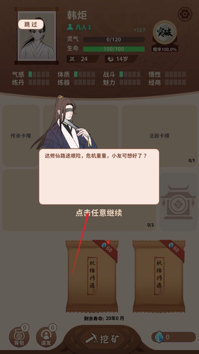 第一局可以随意探索熟悉词条,要是失败了就直接开启第二局,记得选择不死长生诀这个流派——它的核心加点方向是经商和气感,选好后就能开始新的一局了。