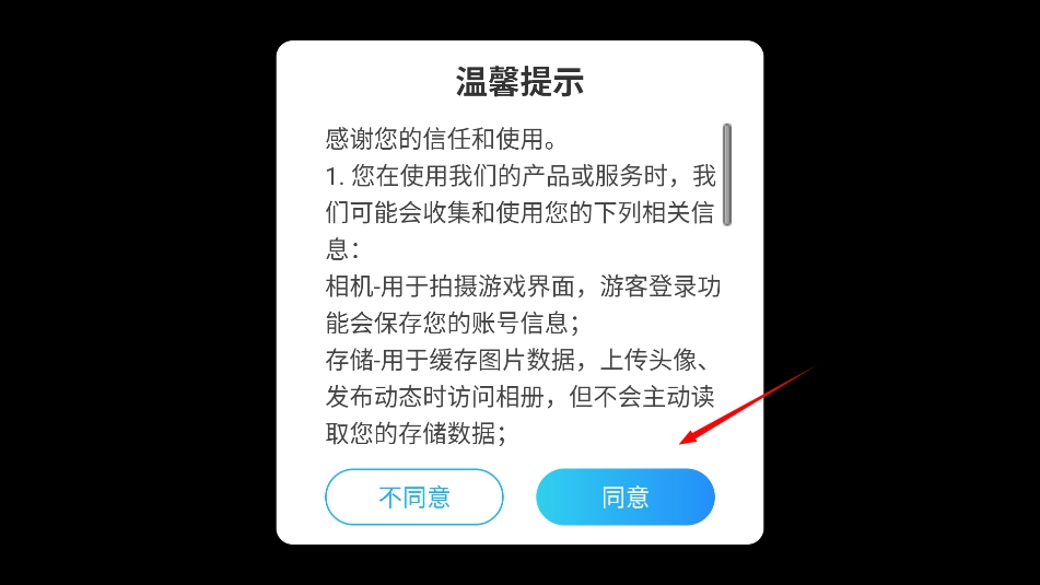 1、首先打开游戏后同意相关的使用权限