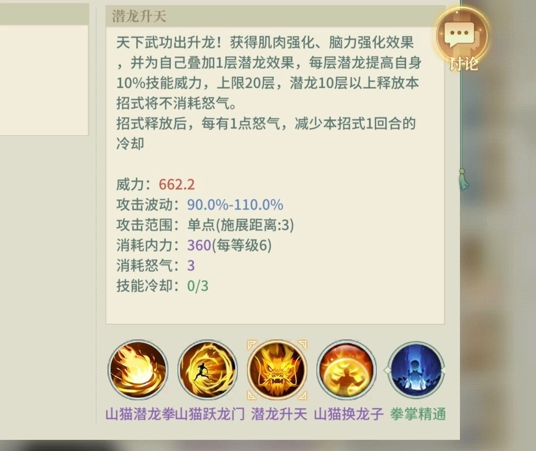 南山龙拳(山猫潜龙拳)是一个低资源很舒服的流派,拥有超高的容错率。当前的副本是偏向于拳法优势的,只有夜战洛阳是刀法优势,龙拳的优势无形的被放大了。潜龙升天3怒气的消耗十分贴合无名剑意被动,当潜龙效果叠到10层能0消耗放3怒的潜龙升天,稳定30%吸血、30%破甲、130%技能威力,配合南山弟子随着时序增加愈战愈强的天赋,直呼无敌。