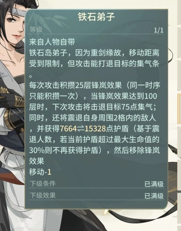 众所周知铁石岛天赋-1移动,那为何说其草头都不如? 要解释这件事之前就得先明白,pve与PVP最大区别在哪里,是pve能手动,有手动就会有操作的好坏,就诞生了手法,而pve最顶尖的东西就是手法,手法能最大的降低你打通副本的资源(认为我这里在吹牛逼的可以看看我其他帖子,我所说的我都已用实力证明)。战棋游戏普遍存在zoc领域,铁石岛独特的直线攻击并不是很差,而因为-1移动让其穿天枫古屐被贴脸就动不了(在敌人zoc领域)导致手法无法施展,普攻只能打到不该打的人,如果穿踏雪无痕,那对比其他门派就少了很多属性。