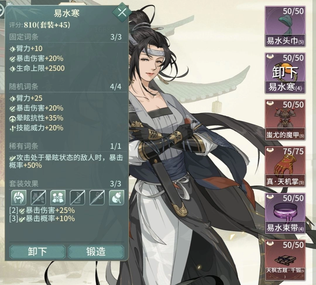 误区提醒:水帝心经并不适配赤卫南拳,南拳强在单挑,补暴击连动加速发育,145命中应付闪避(剑师姐霓裳黄天)。