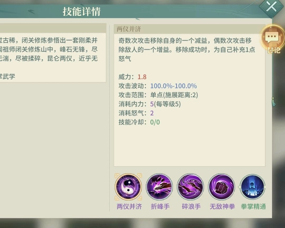 1.5的平砍对比两仪稍逊一筹,但其怒气也选低于两仪,在低资源领域,太极拳注定无法和两仪抗衡,太极拳威力低,左右云手补充了伤害,但是低资源终究无法追平两仪折峰手,技能冷却时间长,代表着防御能力与续航能力不行,3突才能解决防御方面的缺陷,但是玩家的资源积累到一定程度,到了可以主刺杀打pve时,太极拳+刺杀心法,会成为一种爆发力极高的武学组合
