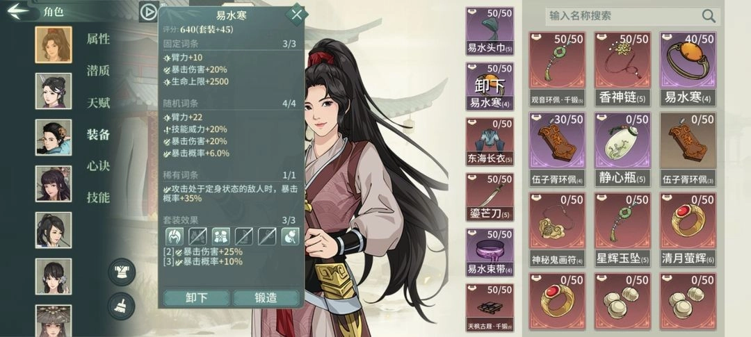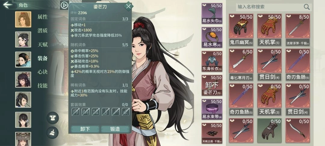 天山剑法参研加爆伤,可以替换成柴刀(15臂力)霹雳棍(参研命中)