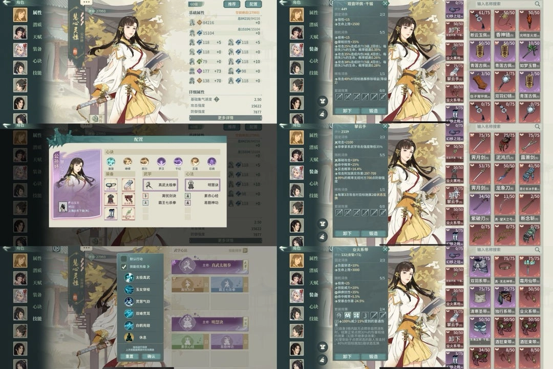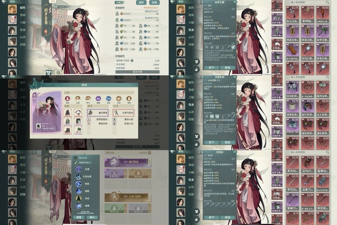 戒指根骨 腰带悟性,目前00,满突补轻身+清心。属性强迫症配置。另外带夸父心诀可以防耶律清怒,技能流畅性更好。