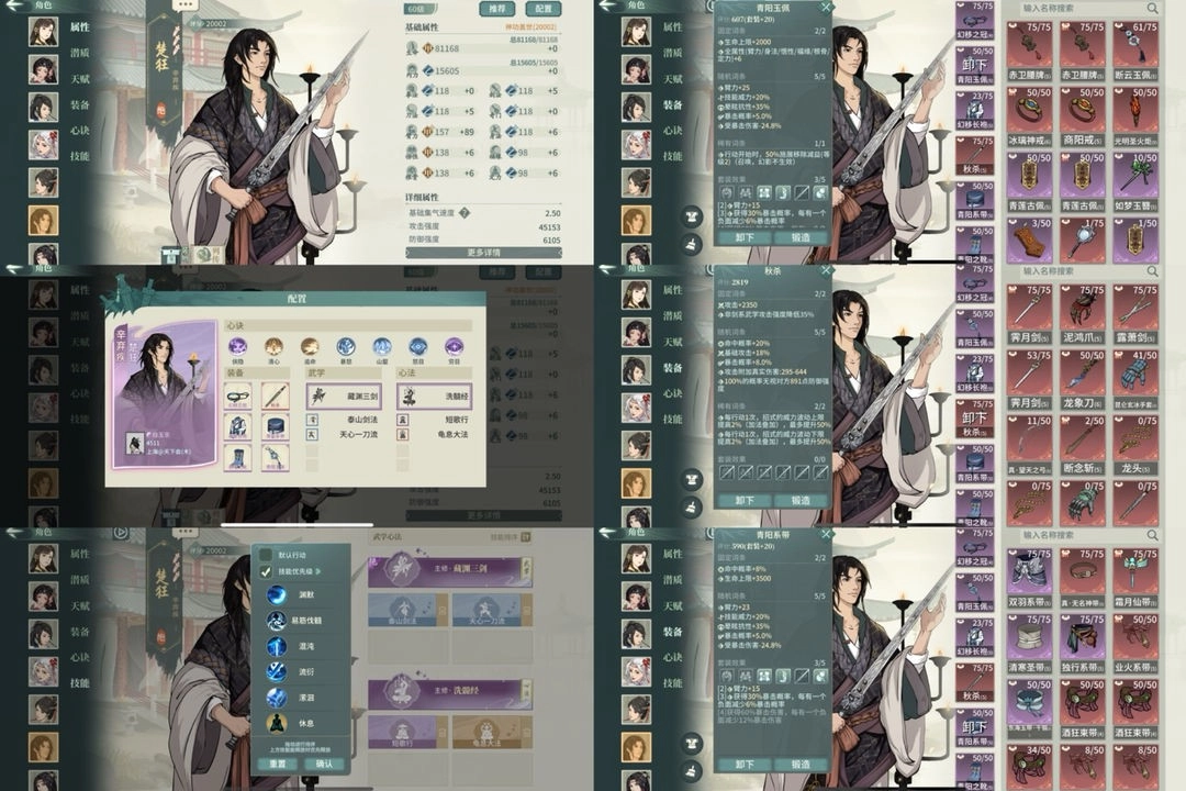 两个男侠客的龟息功法,老谭那边是一定要给的,另一本可以给藏渊的老辛。织女梭、幽引绝弦、藏渊三剑这几样,务必要抽到手。