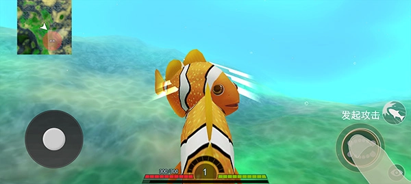 3、遇到其他鱼儿之后,点击右下角第一个键位发起攻击;