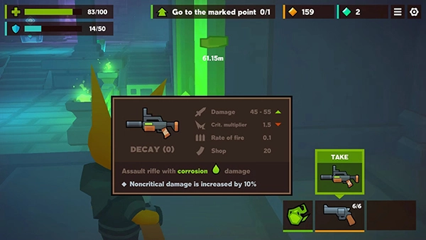 5、消灭敌人后会随机掉落装备和道具,这些装备和道具可以帮助你更快地通关;你可以带着新装备前往下一关的挑战;