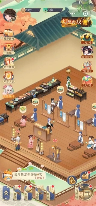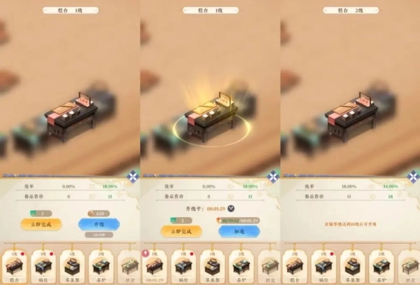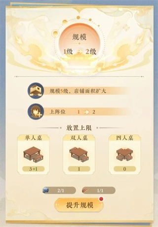 除了店铺和设备的升级,掌柜们也要注意提升茶馆的规模!提升规模后,不仅可以扩大店面,增加餐桌数量,还能增加店员上阵的数量!