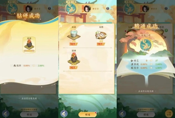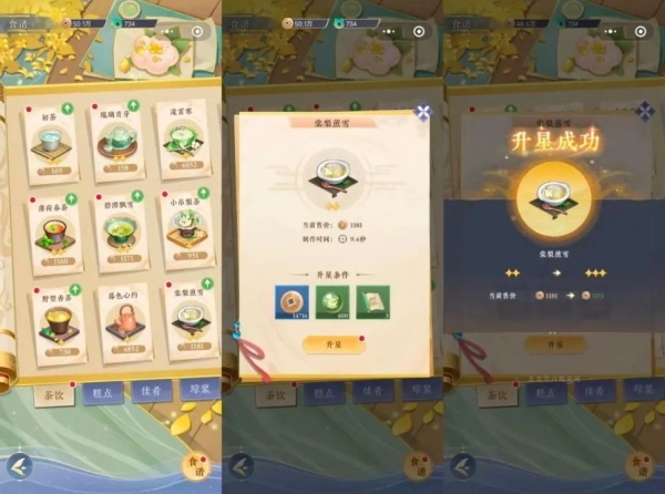 最后,记得要给茶馆的【食谱】做升级呀,部分餐品是具备升级空间的呢!只要消耗[铜钱]、[食谱点]和[启蒙书籍]这几样道具,就能让对应的餐品卖得更贵些!其中,[食谱点]能通过【故世游历】玩法来获取;[启蒙书籍]则可以从【名流之宴】和【故世游历】这两个途径拿到;另外,[食谱点]也能直接在【杂货商肆】里购买到哦。