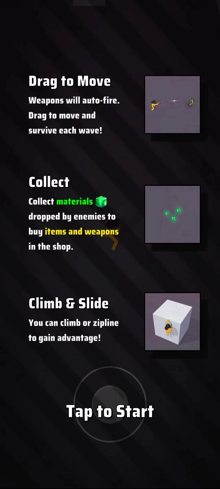 3、之后,玩家可以看见下图这个简易的游戏攻略,点击【tap to start】进入游戏;