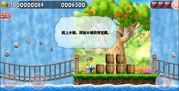 6、冒险途中藏着不少奖励,只要跳上木桶并把它们砸开,就能拿到里面的宝藏;