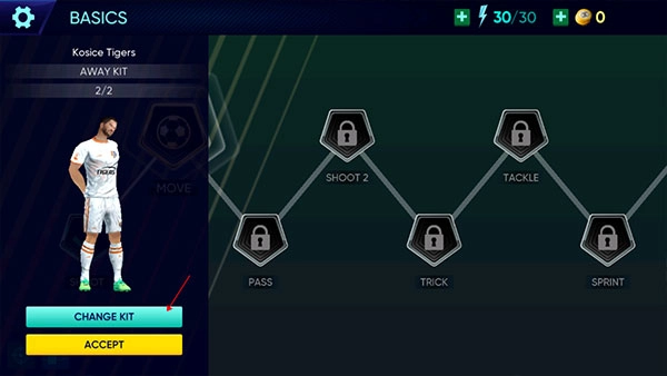 1、安装好足球世界杯游戏后,启动并进入游戏,挑选自己喜爱的队员,点击“CHANGE KIT”按钮来更换球员的装备。