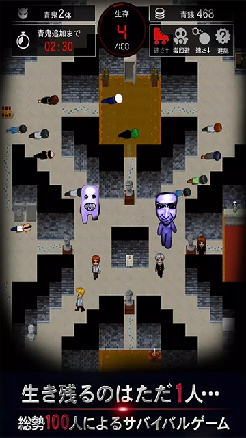 在《青鬼Online》里,有100名玩家和青鬼一同参与竞技(其中部分是NPC),你要扮演他们中的一员,任务是避开青鬼的追捕,坚持存活到最后就能取得胜利。
