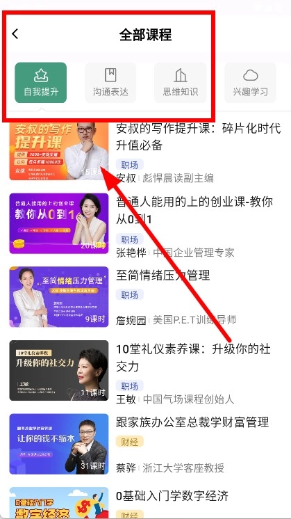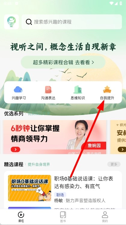 1. 开启APP,于首页点击“自我提升”,进而进入课程分类列表页面。