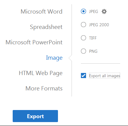 笔记: 如果您不选择“导出所有图像”选项,则 PDF 中的所有页面都将以所选图像文件格式保存。