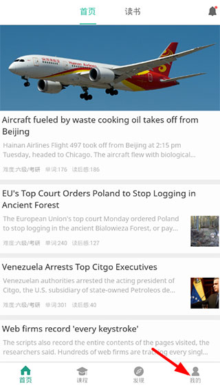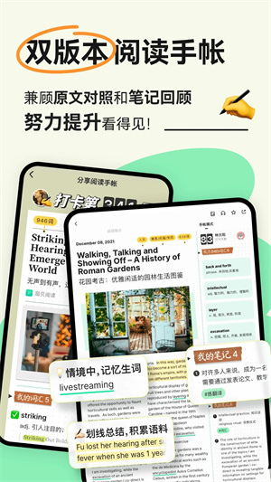 每篇文章中的生词都即时添加到自己的学习计划中,利用扇贝网强大的记忆系统进行学习;