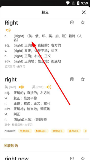 3、打开单词页面,用户可学习单词释义、发音、关联短语等。