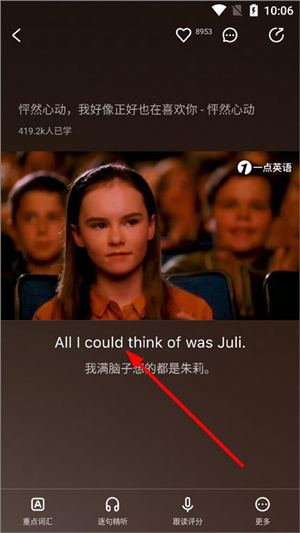 2、进入视频播放页面,用户可查看视频语句中的重点词汇、逐句精听、跟读评分等,点击语句单词;
