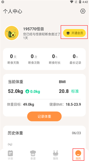 一、首先打开怪兽轻断食app,点击我的,点击会员