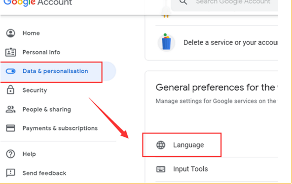 2、在跳转的谷歌账号界面中,点击左侧data选项,然后选择language选项,如图所示。