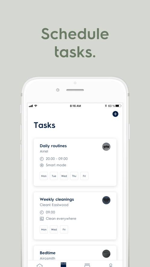 选择清扫功能,让设备展现最佳性能。 只需一眼,家中状况便尽在掌握。 预约任务,实现自动化清扫,打造更优质的家居环境。