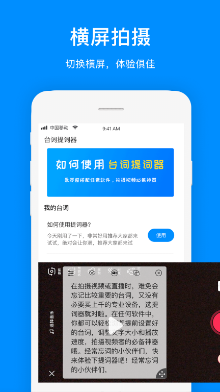 ※最近短视频圈子里很多人提到快提词 我得跟上潮流的步伐 下载试了一下,果然,没有让我失望 那些大网红说的是真的 不仅免费而且好用 横竖屏切换很流畅 拍摄短视频和直播的时候,用起来都很方便 界面设计也很简洁,希望开发者们继续加油 会一直支持你们的。--新生代网红