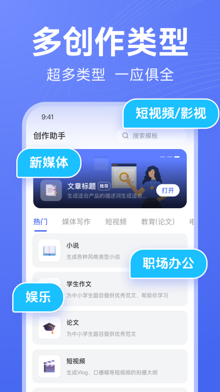 3、在AI写作助手中,用户能够挑选各类写作场景,像论文、报告、散文、小说等等。
