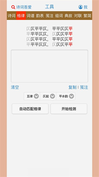 1、您仅需输入诗词作品,系统便会快速指明哪些地方不符合格律,哪些地方没有押韵。