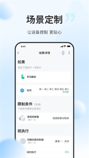 该软件具备依据不同场景灵活调整设备操作的功能,这使得用户能够更为妥善地契合不同环境的实际需求,进而为用户带来个性化的智能控制体验。