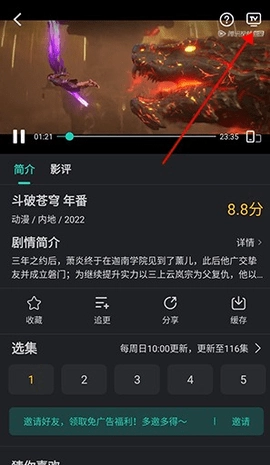 2. 在播放页面,点击播放屏幕,投屏功能对应的图标为右上角的TV图标。