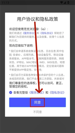 1. 在本站的无忧浏览器上,点击“同意”选项,以同意隐私政策。