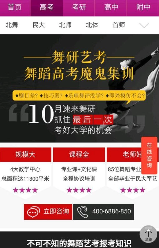 舞研艺考专为舞蹈艺考生打造,不仅提供最新艺考资讯,还开设丰富的艺考课程供大家报名。无论你钟情哪种舞蹈,这里都是绝佳之选,快来了解一下吧!