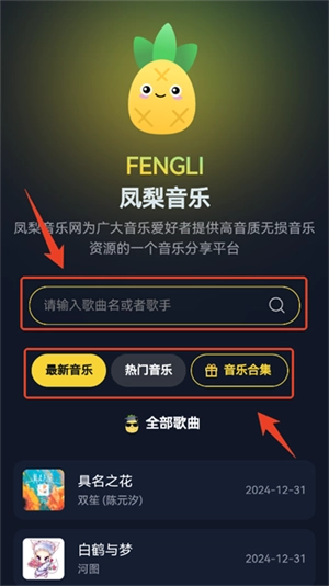 1、打开凤梨音乐,可通过歌曲筛选或是搜索的方式快速找到想要的歌曲资源。