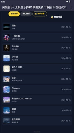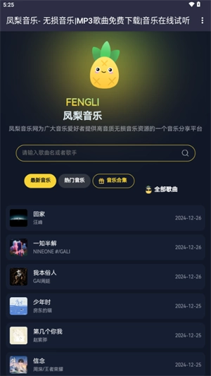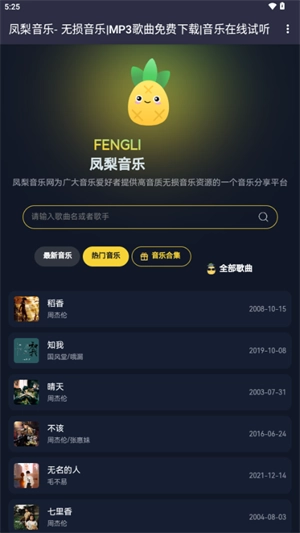 凤梨音乐是一款高品质音乐播放器,拥有丰富的正版音乐资源,覆盖流行、古典、摇滚、电子等多种音乐风格,用户能够第一时间聆听到最新发布的歌曲和专辑。