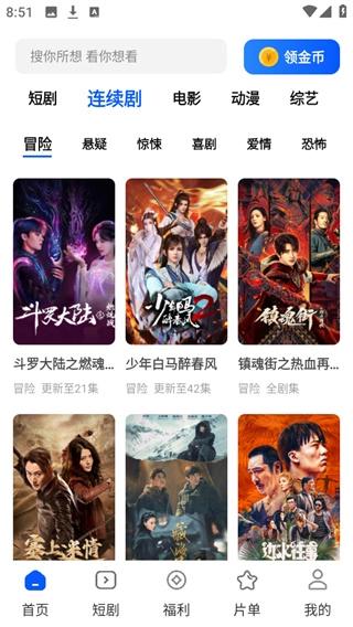 2、如图所示,首页涵盖丰富的短剧、电影、综艺、动漫等板块内容。