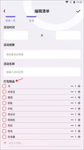2、挑选好你的活动类型、活动时间、需打包的物品等信息后,点击右上角的对钩图标即可。